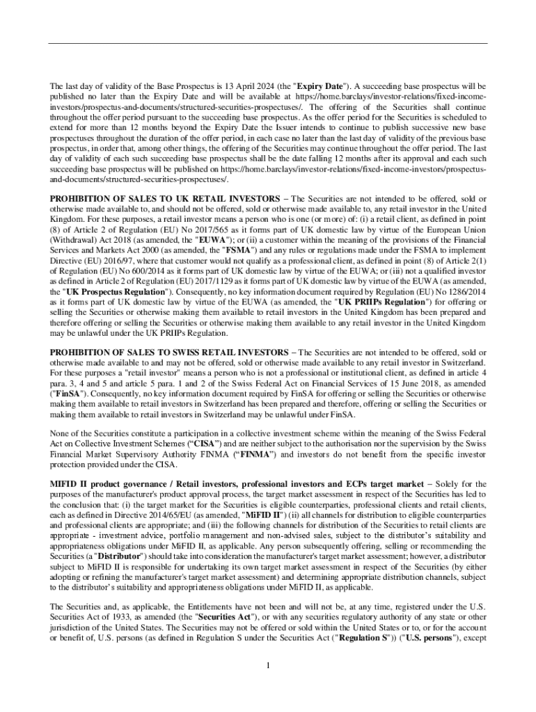 The last day of validity of the Base Prospectus is 13 April 2024 (the \"Expiry Date\"). A succeeding base prospectus will be published no later than the Expiry Date and will be available at https://home.barclays/investorrelations/fixedincomeinvestors/prospectusanddocuments/structuredsecuritiesprospectuses/.
