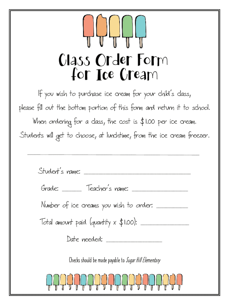 Class Order Form for Ice Cream If you wish to purchase ice cream for your childs class, please fill out the bottom portion of this form and return it to school. When ordering for a class, the cost