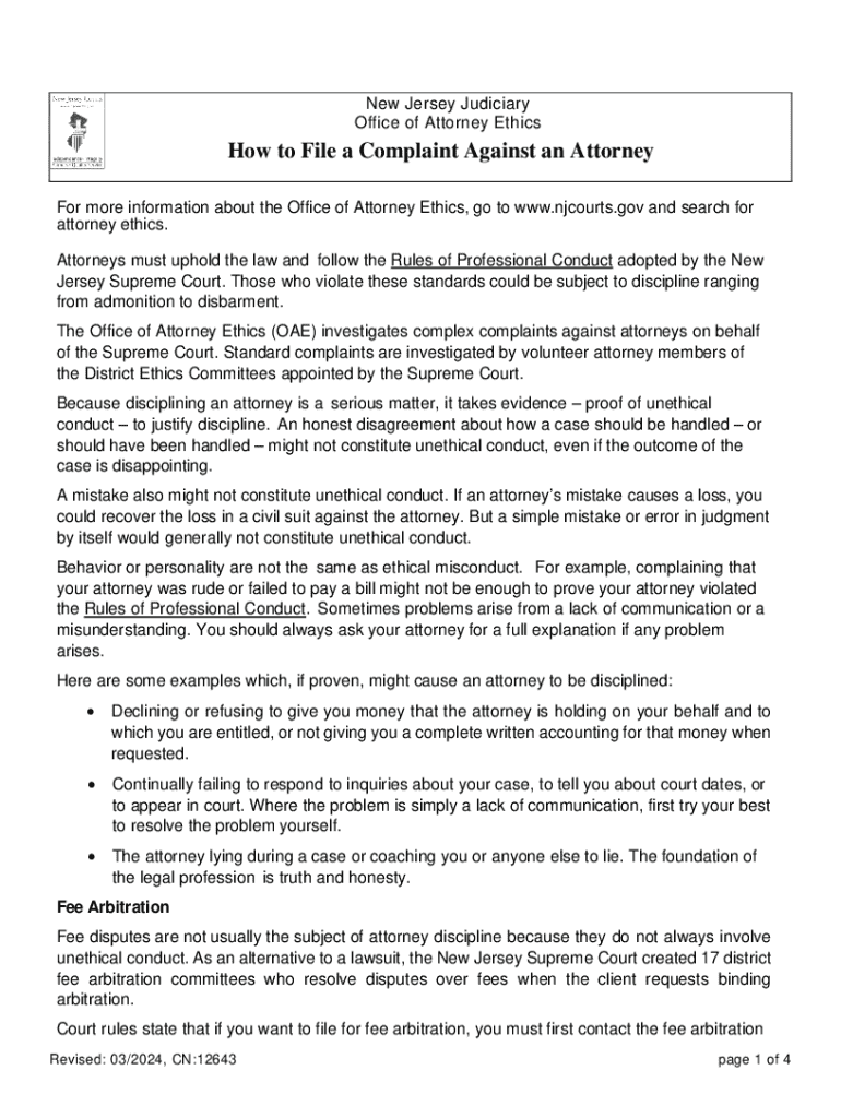 This document provides a comprehensive guide on how to file a complaint against an attorney in New Jersey, detailing the process involved, the types of disciplinary actions available, and the distinction between legal mistakes and unethical conduct. It explains the steps involved in filing a grievance, the investigation process, as well as the role of the Disciplinary Review Board and Supreme Court in reviewing complaints against attorneys.