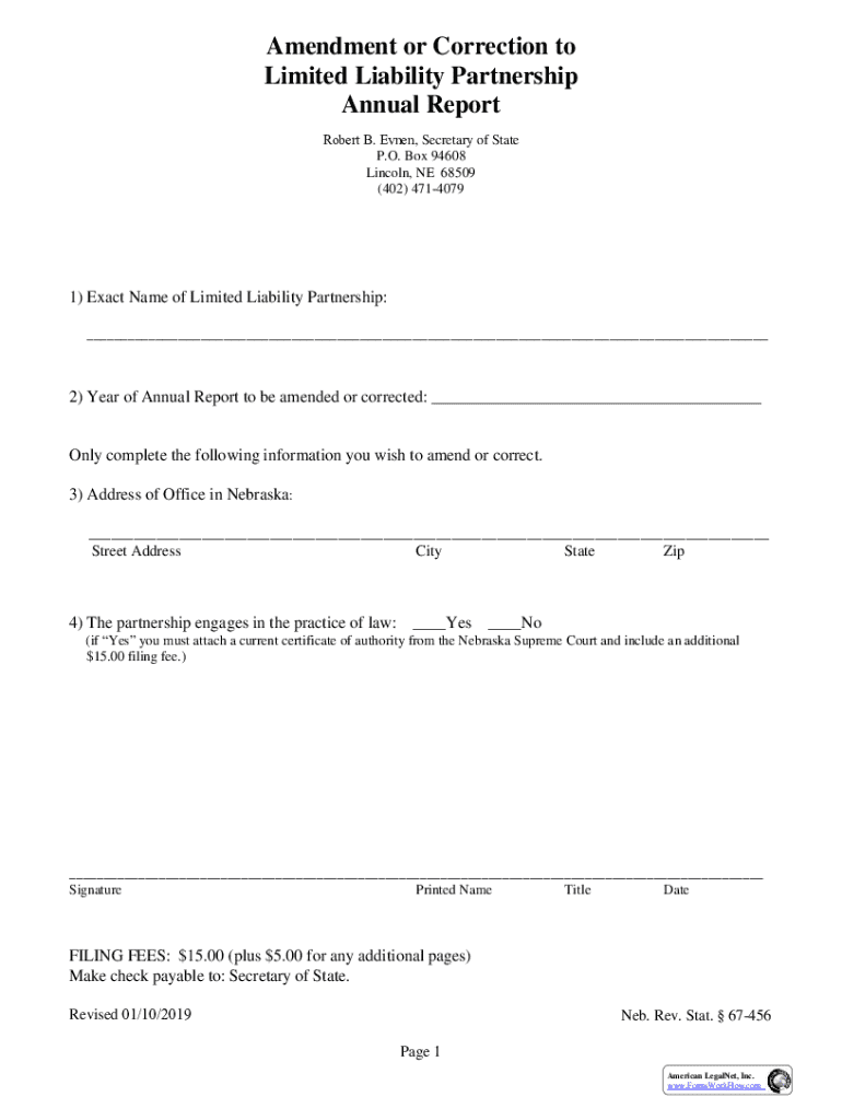 This document is used to amend or correct information in the Annual Report for a Limited Liability Partnership registered in Nebraska. It requires the exact name of the partnership, the year of the report being amended, and the address of the office in Nebraska. Additionally, it addresses the partnership\'s engagement in the practice of law and outlines the necessary filing fees and submission requirements.
