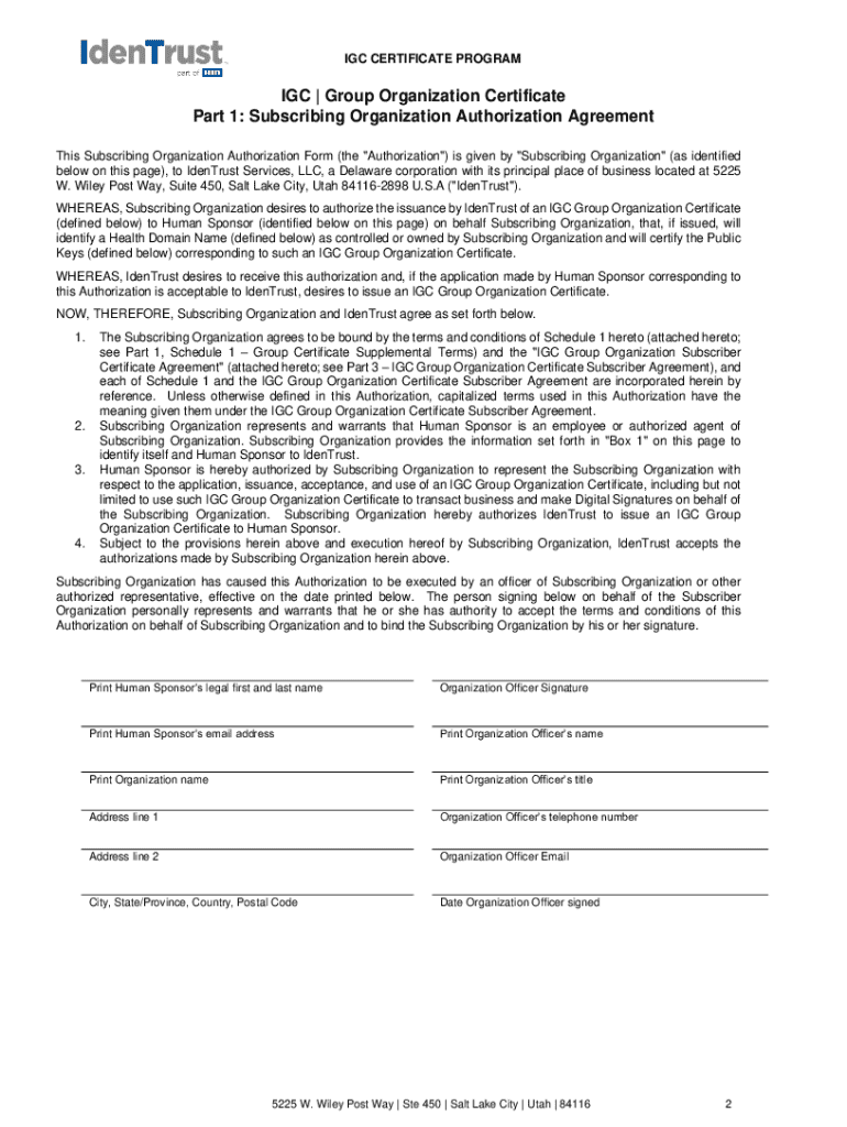 This document outlines the procedures and requirements for applying for an IGC Group Organization Certificate through IdenTrust Services, LLC. It includes instructions for completing the necessary forms, such as the Subscribing Organization Authorization Agreement and the In-Person Identification Form, along with identity verification options, submission guidelines, and legal agreements involved in the certificate application process.