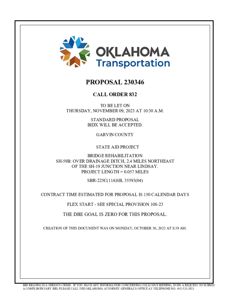 PROPOSAL 230346 CALL ORDER 832 TO BE LET ON THURSDAY, NOVEMBER 09, 2023 AT 10:30 A.M. STANDARD PROPOSAL BIDX WILL BE ACCEPTED. GARVIN COUNTY STATE AID PROJECT BRIDGE REHABILITATION SH59B: OVER DRAINAGE
