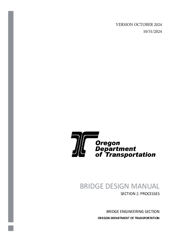 This document provides detailed guidance on bridge design processes, including the use of structural design software, quality management, project design phases, and specifications required by the Oregon Department of Transportation. It outlines the necessary steps and deliverables for the successful completion of bridge engineering projects, emphasizing quality control and assurance throughout the design stages.