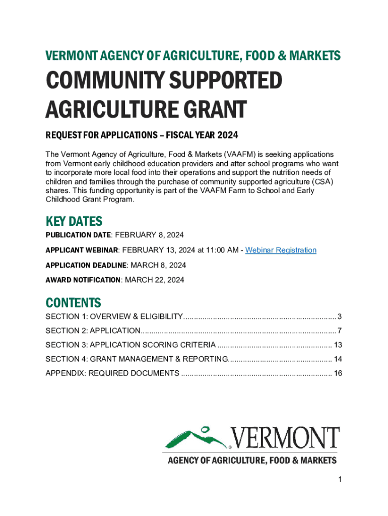 VERMONT AGENCY OF AGRICULTURE, FOOD & MARKETSCOMMUNITY SUPPORTED AGRICULTURE GRANT REQUEST FOR APPLICATIONS FISCAL YEAR 2024The Vermont Agency of Agriculture, Food & Markets (VAAFM) is seeking applications