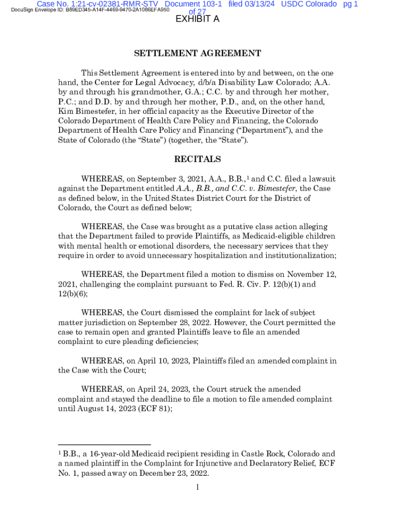 This Settlement Agreement is entered into between the Center for Legal Advocacy, representing certain Plaintiffs, and the Colorado Department of Health Care Policy and Financing to rectify claims regarding inadequate Medicaid services for children with mental health needs. The agreement outlines terms for improved service delivery, compliance requirements, and dispute resolution mechanisms.