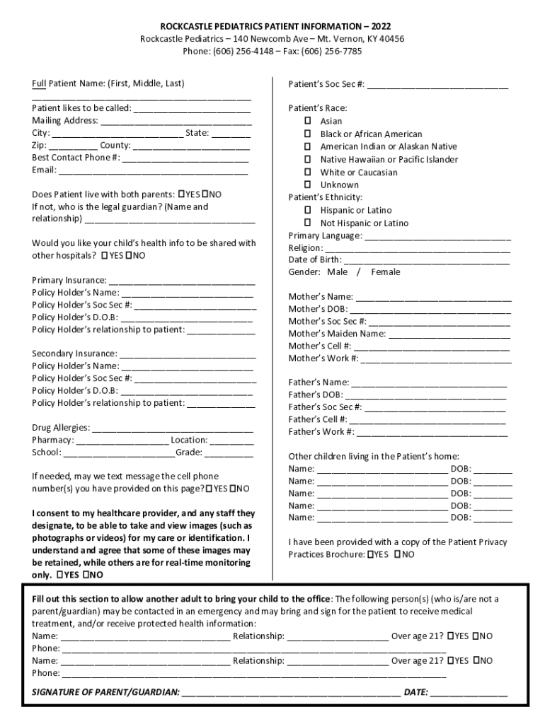 A comprehensive patient information form for Rockcastle Pediatrics, gathering essential details about the patient, including personal information, insurance details, allergies, and consent for sharing health information.