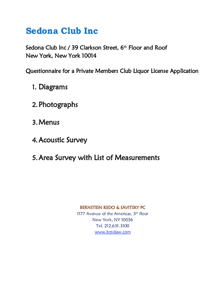 Sedona Club Inc Sedona Club Inc / 39 Clarkson Street, 6th Floor and Roof New York, New York 10014 Questionnaire for a Private Members Club Liquor License Application1. Diagrams 2. Photographs 3. Menus