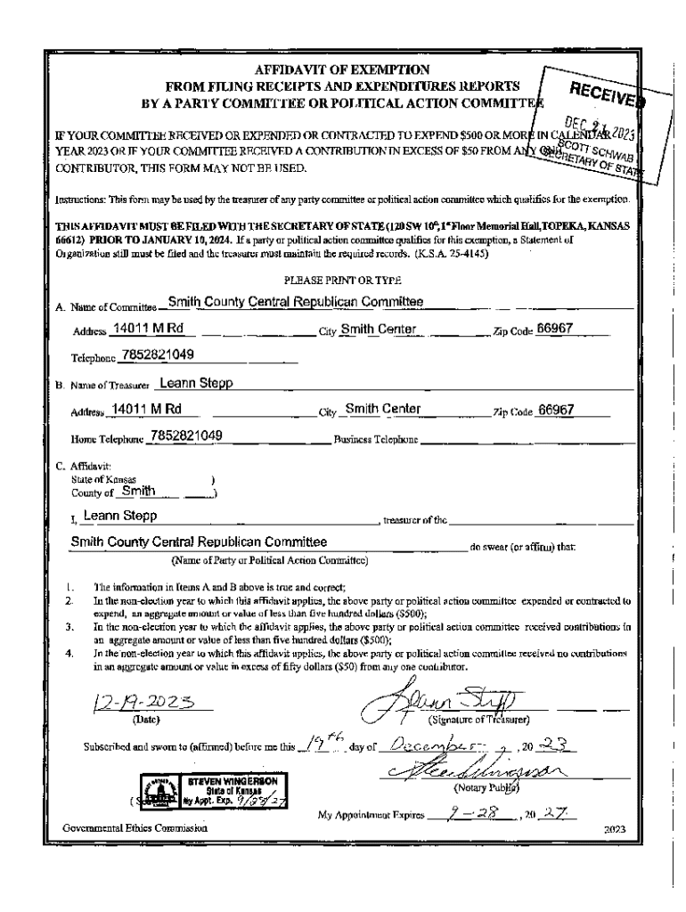 This affidavit is to be used by the treasurer of a party committee or political action committee that qualifies for an exemption from filing receipts and expenditures reports if certain financial thresholds are not exceeded during the non-election year. It must be filed with the Secretary of State before January 10, 2024.