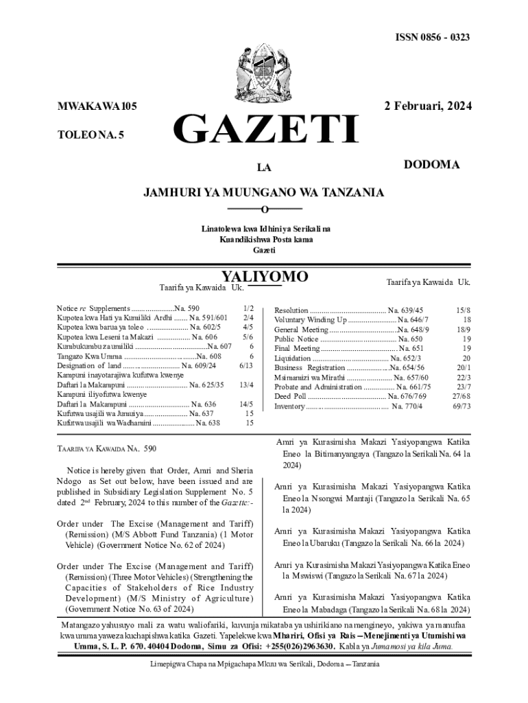 ISSN 0856 03232 Februari 2024MWAKA WA 105GAZETITOLEO NA. 52 Februari, 2024DODOMALAJAMHURI YA MUUNGANO WA TANZANIA O Linatolewa kwa Idhini ya Serikali na Kuandikishwa Posta kama GazetiYALIYOMOTaarifa