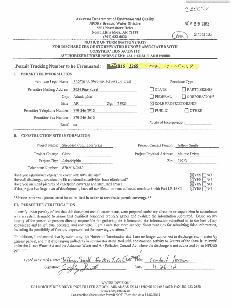 Get the free Notice of Termination for Dischargers of Stormwater Runoff