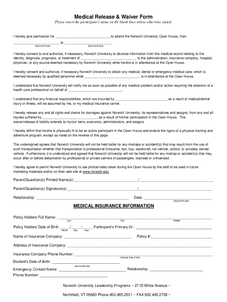 This form is required for participants attending the Norwich University Open House, granting permission for medical treatment and waiving liability for injuries that may occur during the event. It includes sections for participant details, medical insurance information, and parental consent.