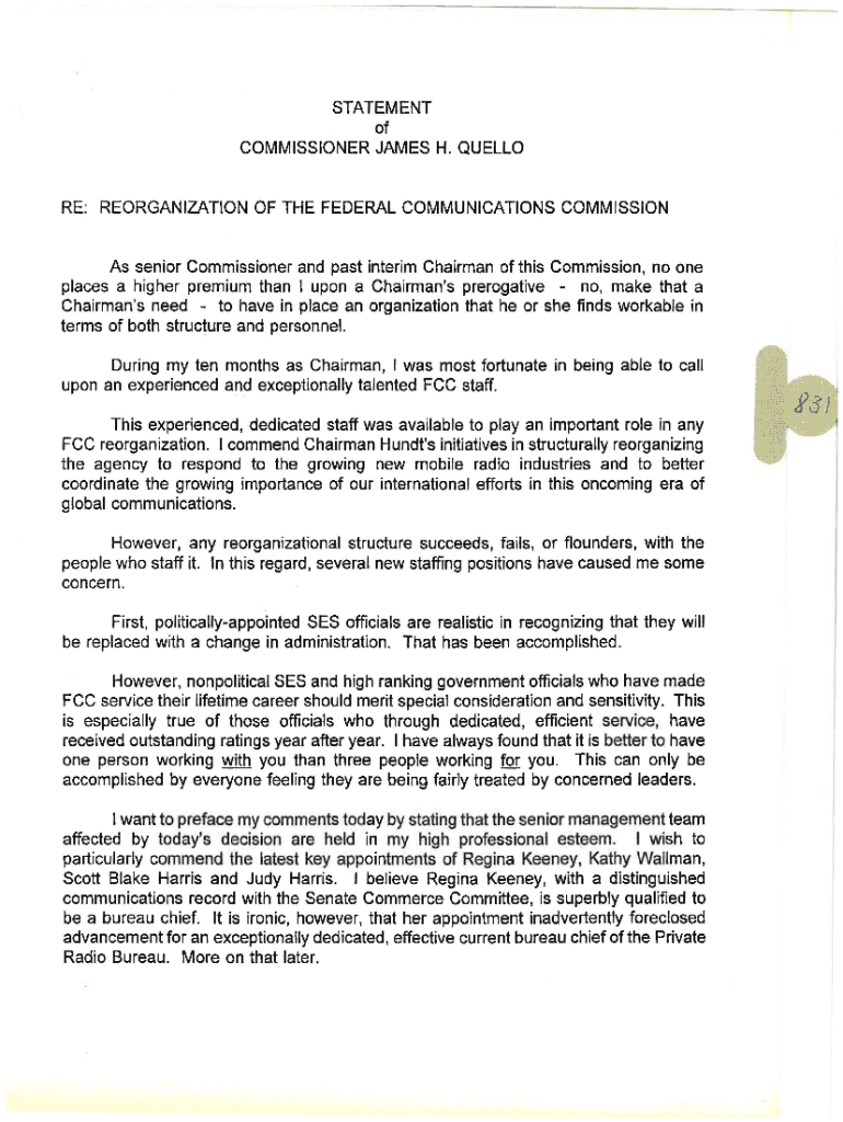 STATEMENT of COMMISSIONER JAMES H. QUELLORE: REORGANIZATION OF THE FEDERAL COMMUNICATIONS COMMISSIONAs senior Commissioner and past interim Chairman of this Commission, no one places a higher premium