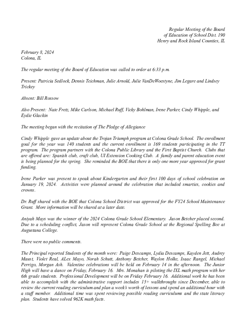 Minutes from the regular meeting of the Board of Education of School District 190, detailing discussions on various programs, staffing, policies, and financial decisions made during the meeting held on February 8, 2024.