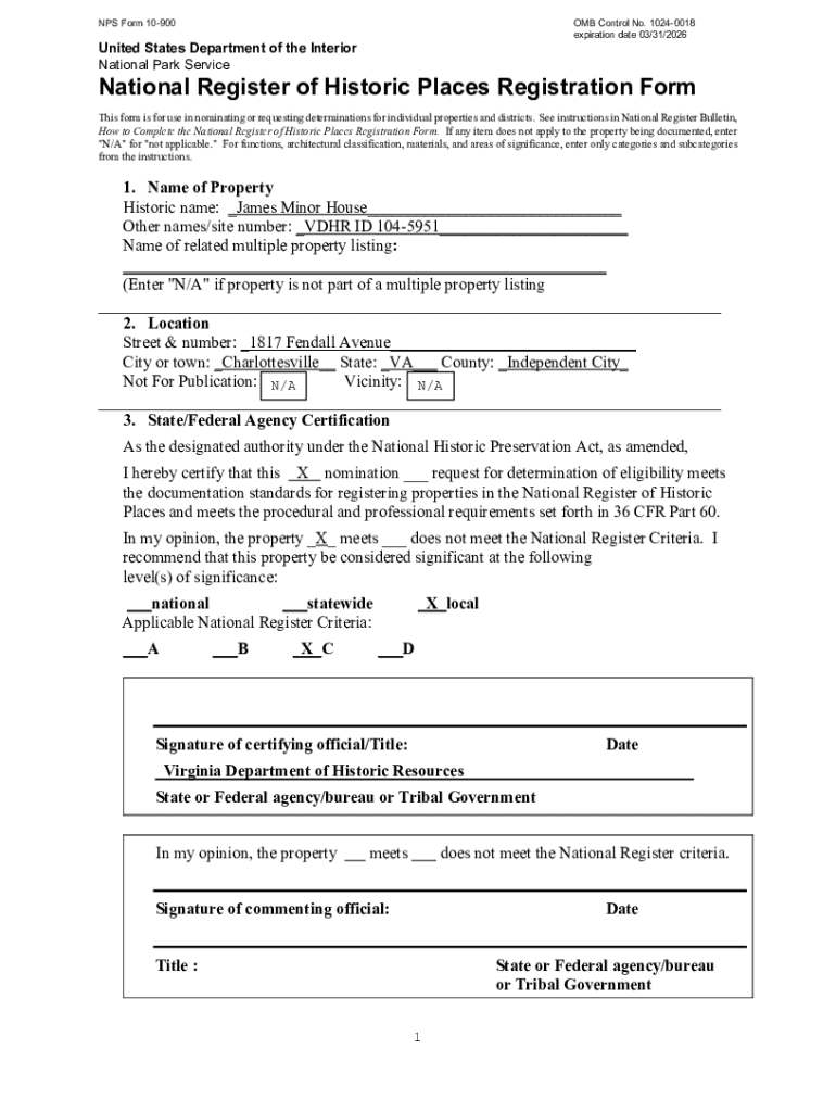 This document serves as the National Register of Historic Places Registration Form for the James Minor House located at 1817 Fendall Avenue, Charlottesville, Virginia. It outlines details for the property, including its historical significance, architectural classification, and the nomination process under the National Historic Preservation Act. The house, designed by architect Milton Grigg around 1937, is recognized for its Colonial Revival style and retains much of its original structure...