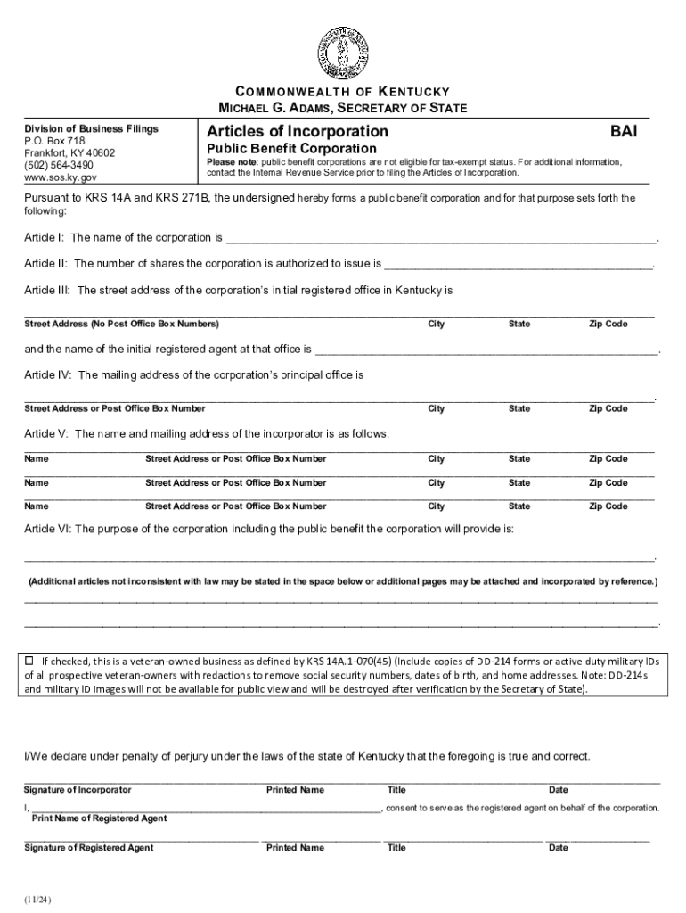 C O M MO N W EA L T H O F K EN TU CK Y MICHAEL G. ADAMS, SECRETARY OF STATE Division of Business Filings P.O. Box 718 Frankfort, KY 40602 (502) 5643490 www.sos.ky.govArticles of IncorporationBAIPublic