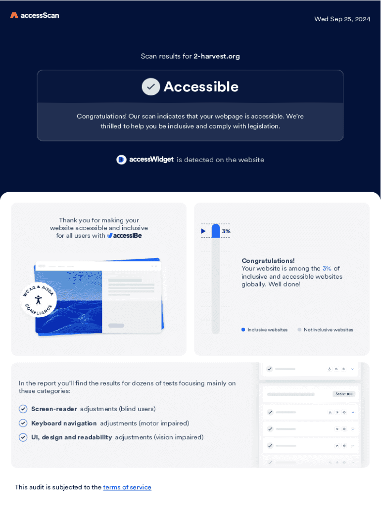 Wed Sep 25, 2024Scan results for 2harvest.orgAccessible Congratulations! Our scan indicates that your webpage is accessible. Were thrilled to help you be inclusive and comply with legislation.is detected