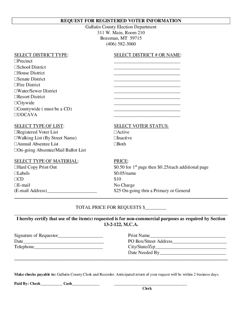 REQUEST FOR REGISTERED VOTER INFORMATION Gallatin County Election Department 311 W. Main, Room 210 Bozeman, MT 59715 (406) 5823060 SELECT DISTRICT TYPE: Precinct School District House District Senate