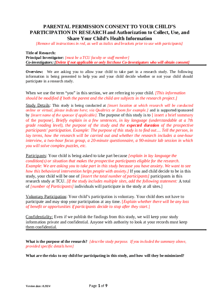 The Parental Permission Consent to Your Child's ... - RESEARCH - research tcu is a fillable form in MS Word extension that can be completed and signed for specific needs. In that case, it is furnished to the relevant addressee in order to provide certain information of certain kinds. The completion and signing is available in hard copy by hand or via a suitable application e. g. PDFfiller. These services help to send in any PDF or Word file without printing them out. It also allows you to edit it depending on your requirements and put a legal digital signature. Once you're good, the user sends the Parental Permission Consent to Your Child's ... - RESEARCH - research tcu to the respective recipient or several of them by mail and even fax. PDFfiller provides a feature and options that make your document of MS Word extension printable. It provides a variety of options for printing out. It doesn't matter how you distribute a form after filling it out - in hard copy or electronically - it will always look neat and clear. In order not to create a new writable document from the beginning all the time, turn the original form into a template. After that, you will have a customizable sample.
