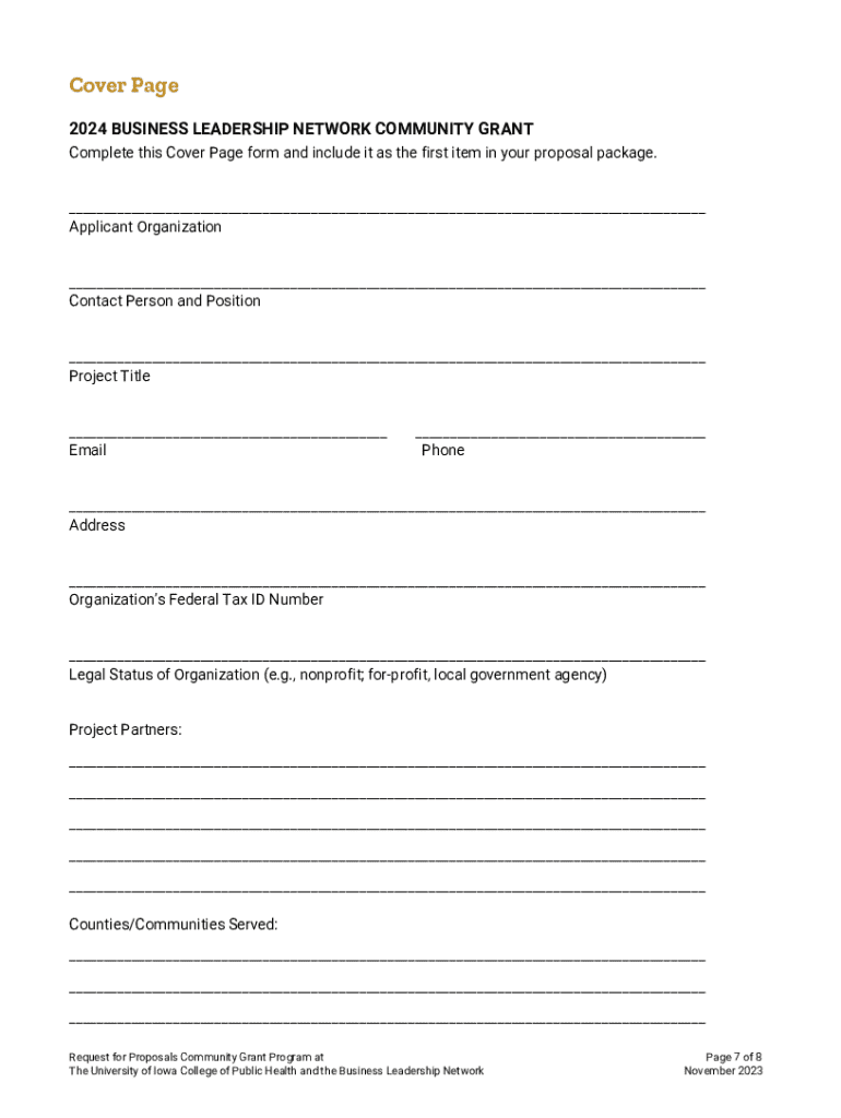 This document outlines the Request for Proposals for the Business Leadership Network Community Grant Program at the University of Iowa, intended to encourage community collaborations to address public health needs in smaller Iowa communities. It details eligibility criteria, use of funds, review process, timeline, and submission guidelines for organizations aiming to apply for grant funding.