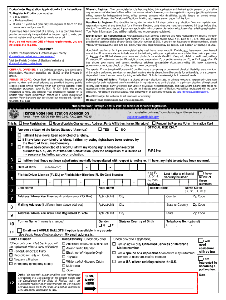 Florida Voter Registration ApplicationPart 1 Instructions To Register in Florida, you must be: a U.S. citizen, a Florida resident, at least 18 years old (you may preregister at 16 or 17, but cannot