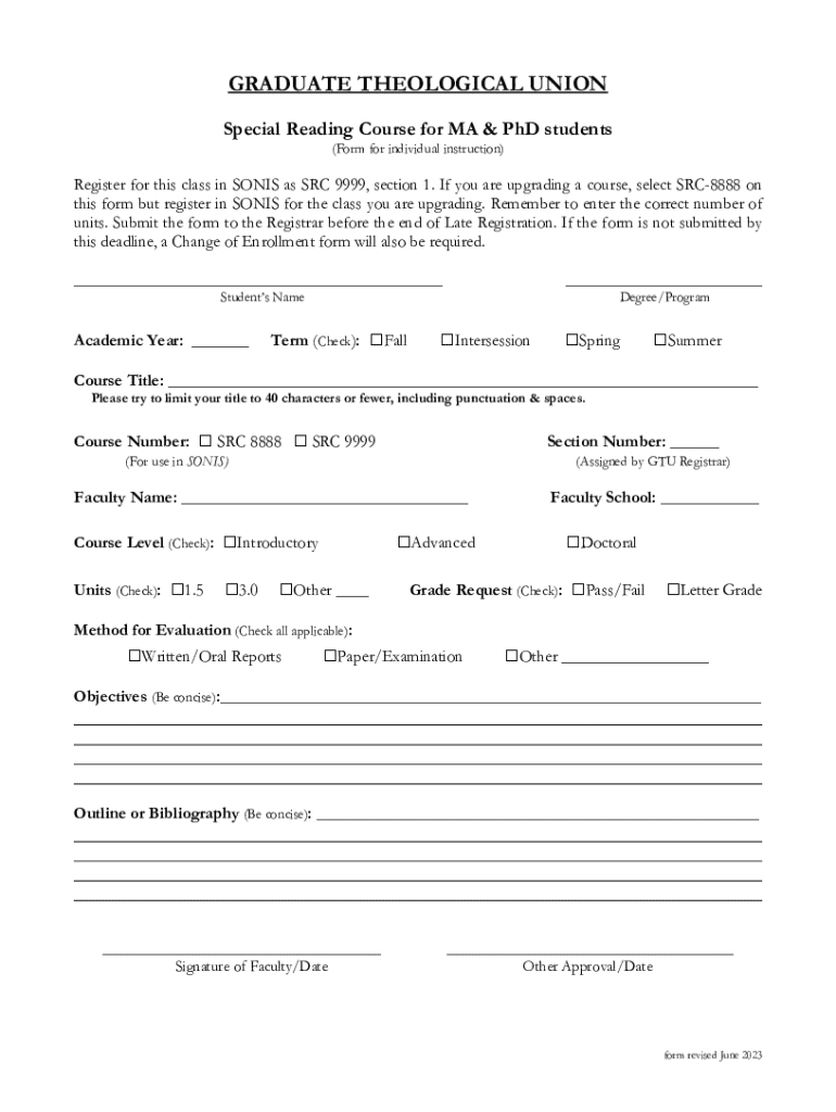 GRADUATE THEOLOGICAL UNION Special Reading Course for MA & PhD students (Form for individual instruction)Register for this class in SONIS as SRC 9999, section 1. If you are upgrading a course, select