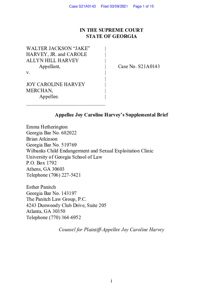 Case S21A0143Filed 03/09/2021Page 1 of 15IN THE SUPREME COURT STATE OF GEORGIA WALTER JACKSON JAKE HARVEY, JR. and CAROLE ALLYN HILL HARVEY Appellant, v.| | | | | | JOY CAROLINE HARVEY | MERCHAN,