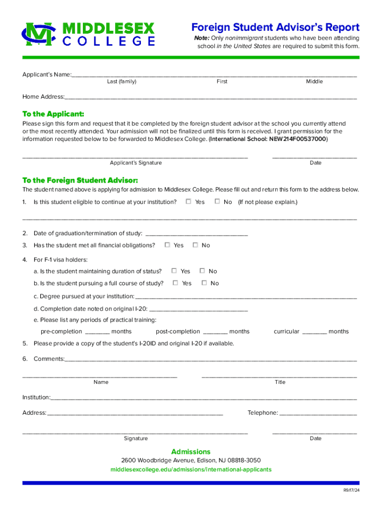 This form is required for nonimmigrant students applying for admission to Middlesex College. It must be completed by the foreign student advisor at the student\'s current or most recent school to confirm eligibility and provide necessary information regarding the student\'s academic status and financial obligations.