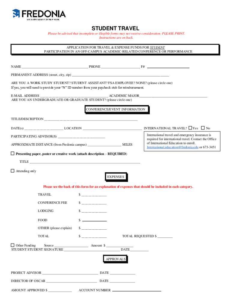 To fill out a student travel application, one must provide personal information, travel details, purpose of the trip, and any required signatures, usually from a guardian or advisor, and submit it according to the institution's guidelines.