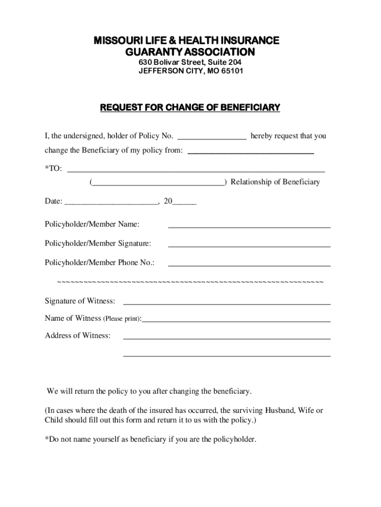 This form is used to request a change of beneficiary for a life or health insurance policy held with the Missouri Life & Health Insurance Guaranty Association. It requires the policyholder to provide details of the new beneficiary and their relationship, along with necessary signatures.