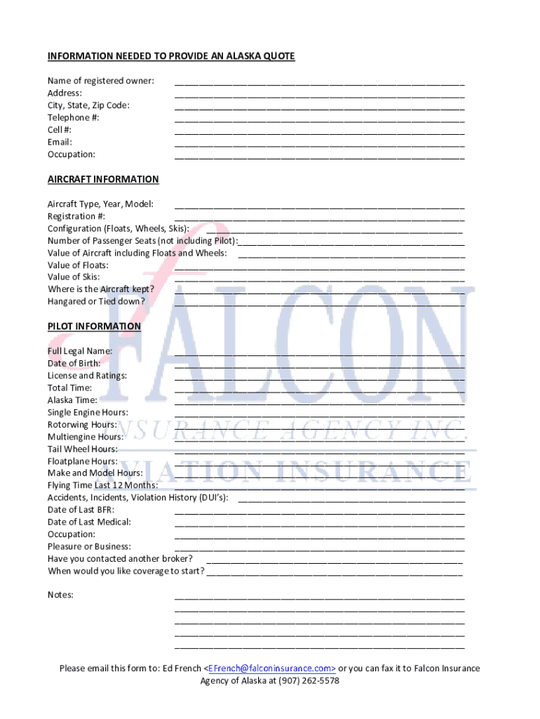 INFORMATION NEEDED TO PROVIDE AN ALASKA QUOTE Name of registered owner: Address: City, State, Zip Code: Telephone #: Cell #: Email: Occupation:___ ___ ___ ___ ___ ___ ___AIRCRAFT INFORMATION ___ Aircraft