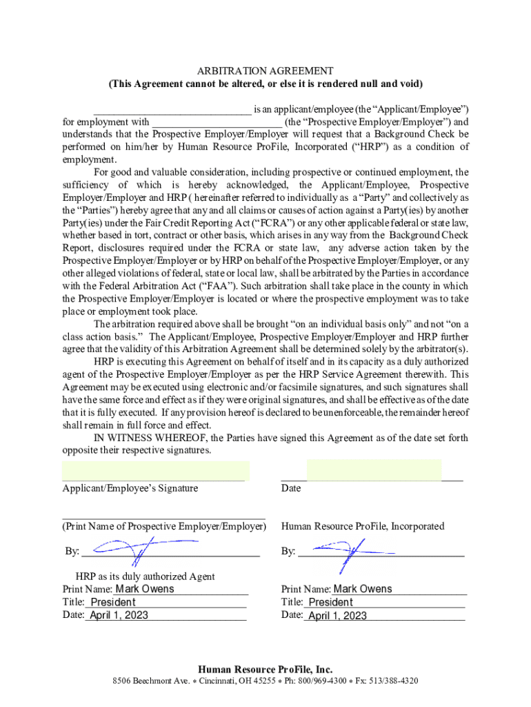 This document outlines the agreement between an applicant/employee and a prospective employer regarding the arbitration of claims related to a background check conducted by Human Resource ProFile, Incorporated (HRP). It includes provisions for the arbitration process, individual claims, and necessary authorizations for background information retrieval.