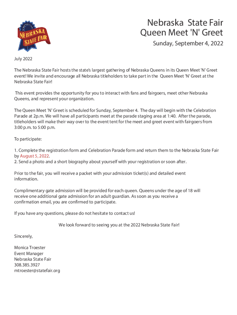 Nebraska State Fair Queen Meet \'N\' Greet Sunday, September 4, 2022 July 2022 The Nebraska State Fair hosts the states largest gathering of Nebraska Queens in its Queen Meet \'N\' Greet event! We