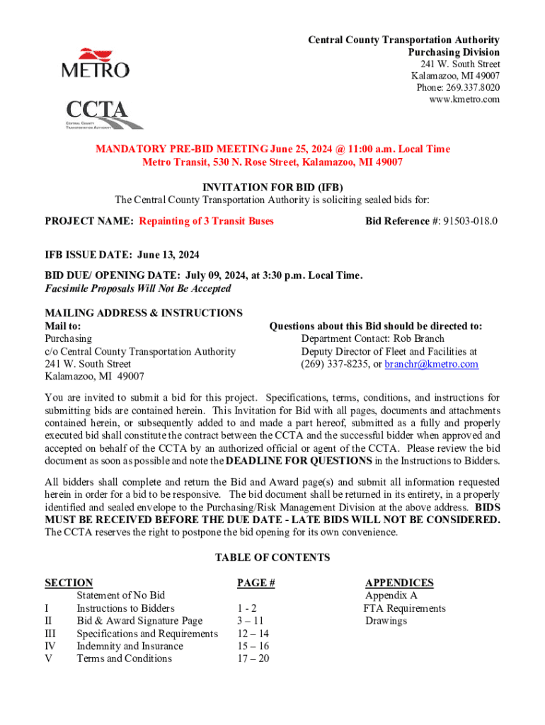 Central County Transportation Authority Purchasing Division241 W. South Street Kalamazoo, MI 49007 Phone: 269.337.8020 www.kmetro.comMANDATORY PREBID MEETING June 25, 2024 @ 11:00 a.m. Local Time