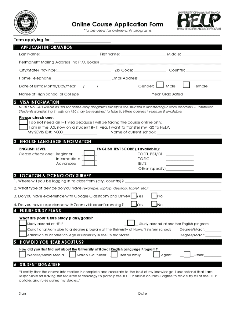 This form is used for applicants to enroll in online-only programs at the University of Hawaii. It collects personal information, visa status, English language proficiency, technology access, and future study plans.