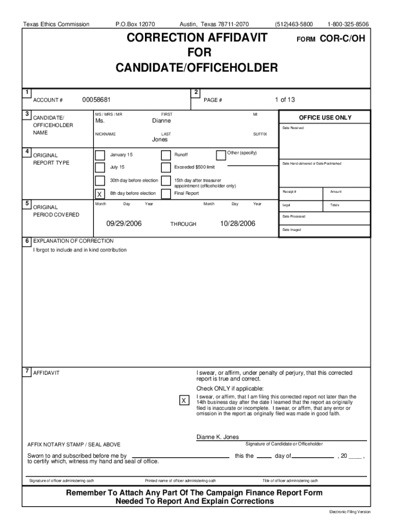 Texas Ethics CommissionP.O.Box 12070Austin, Texas 787112070(512)4635800CORRECTION AFFIDAVIT FOR CANDIDATE/OFFICEHOLDER 1CORC/OH200058681ACCOUNT #3FORM18003258506CANDIDATE/ OFFICEHOLDER NAME1 of 13PAGE
