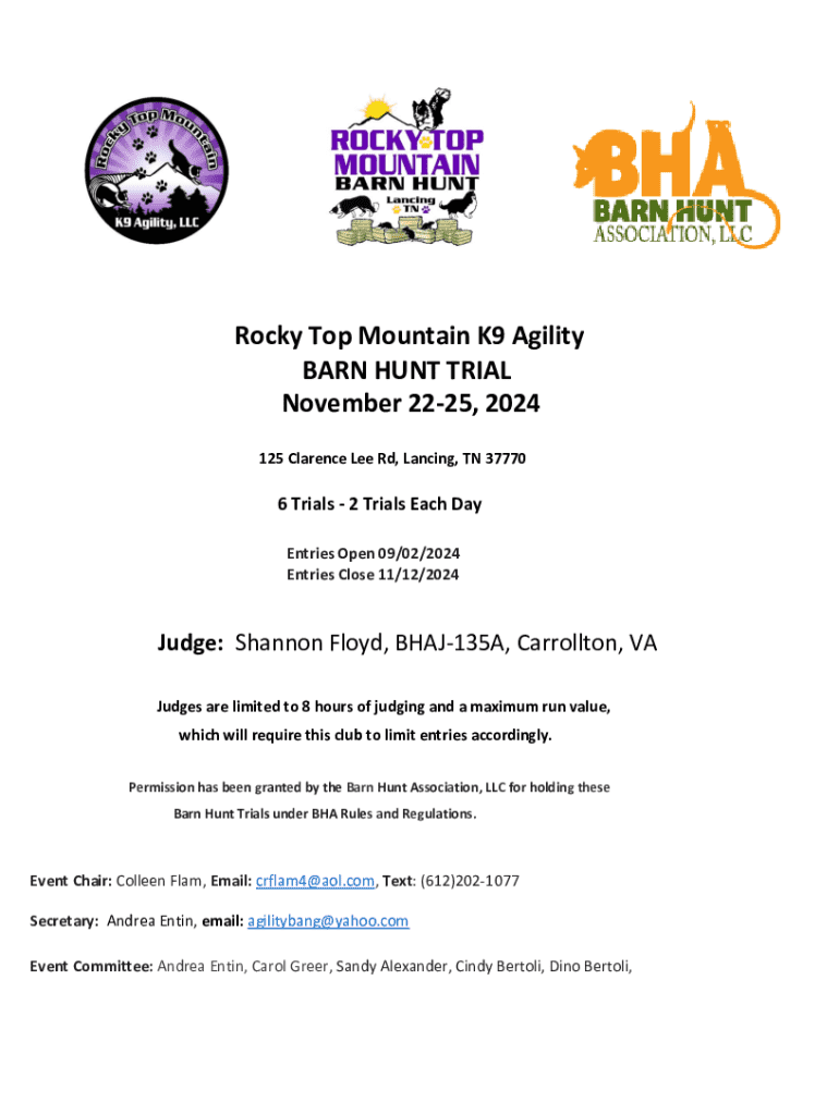 Rocky Top Mountain K9 Agility BARN HUNT TRIAL November 2225, 2024 125 Clarence Lee Rd, Lancing, TN 377706 Trials 2 Trials Each Day Entries Open 09/02/2024 Entries Close 11/12/2024Judge: Shannon Floyd,