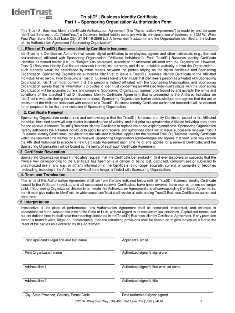 This document outlines the process and requirements for obtaining a TrustID® Business Identity Certificate from IdenTrust Services, LLC, including necessary forms, identification requirements, and terms of use. It describes the responsibilities of applicants and their sponsoring organizations, as well as details about certificate issuance, renewal, and revocation.