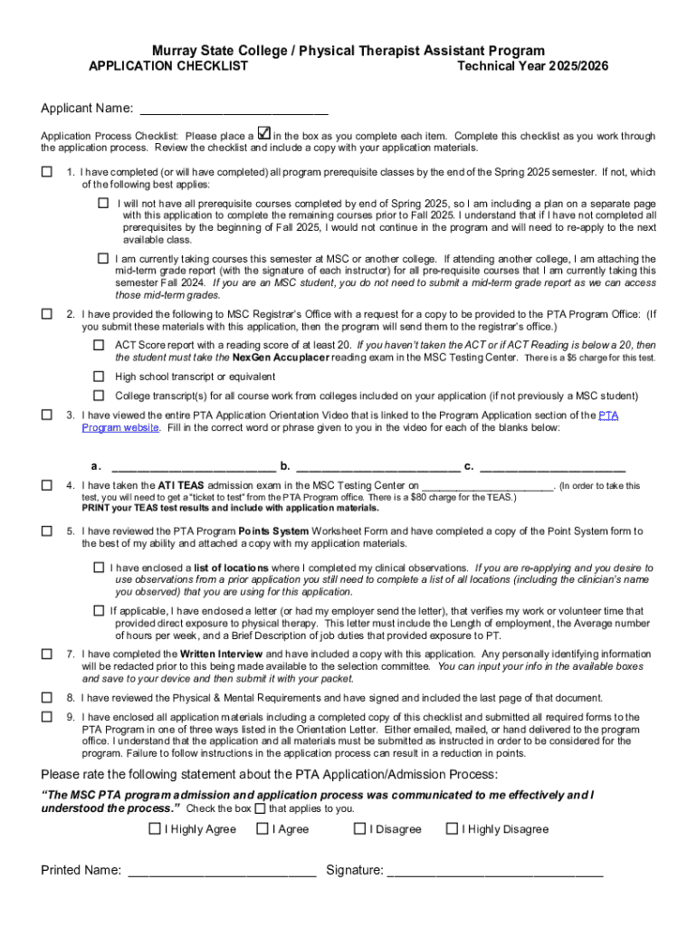 This document serves as an application checklist for prospective students applying to the Physical Therapist Assistant Program at Murray State College for the technical year 2025/2026. It outlines the necessary prerequisites, required documents, and steps to complete the application process effectively.