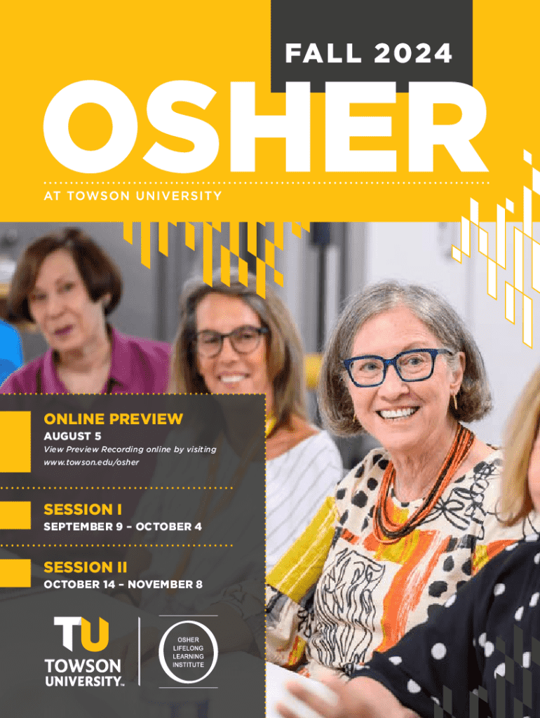 FALL 2024ONLINE PREVIEW AUGUST 5View Preview Recording online by visiting www.towson.edu/osherSESSION ISEPTEMBER 9 OCTOBER 4SESSION IIOCTOBER 14 NOVEMBER 8A NOTE FROM THE DIRECTOR Hello Lifelong Learners,