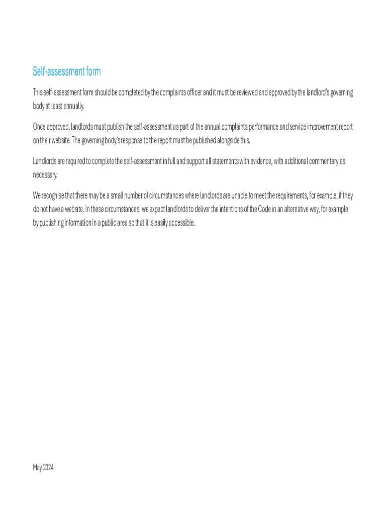 Selfassessment form This selfassessment form should be completed by the complaints o icer and it must be reviewed and approved by the landlords governing body at least annually. Once approved, landlords