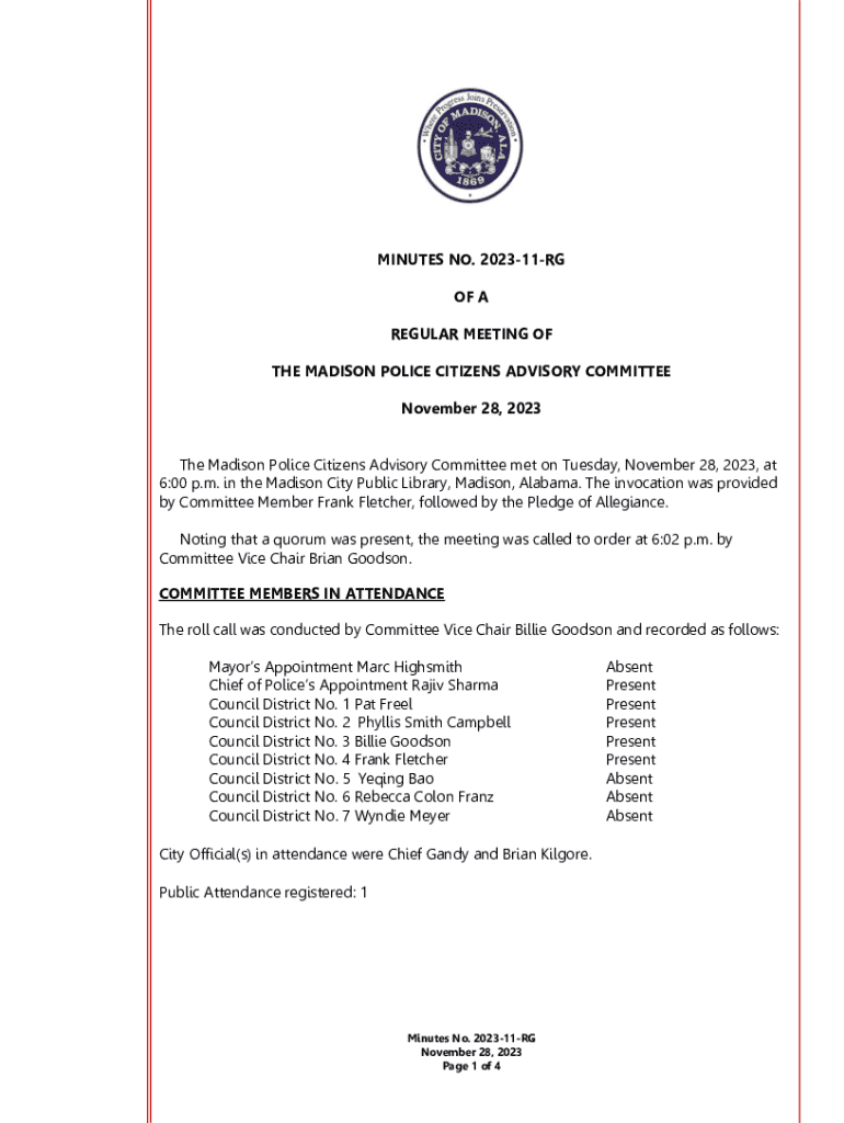 5MINUTES NO. 202311RG OF A REGULAR MEETING OF THE MADISON POLICE CITIZENS ADVISORY COMMITTEE November 28, 2023 The Madison Police Citizens Advisory Committee met on Tuesday, November 28, 2023, at