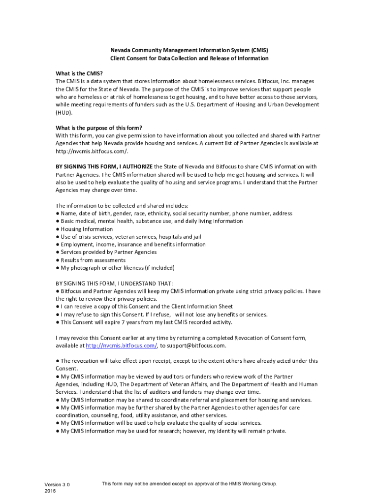Nevada Community Management Information System (CMIS) Client Consent for Data Collection and Release of Information What is the CMIS? The CMIS is a data system that stores information about homelessness
