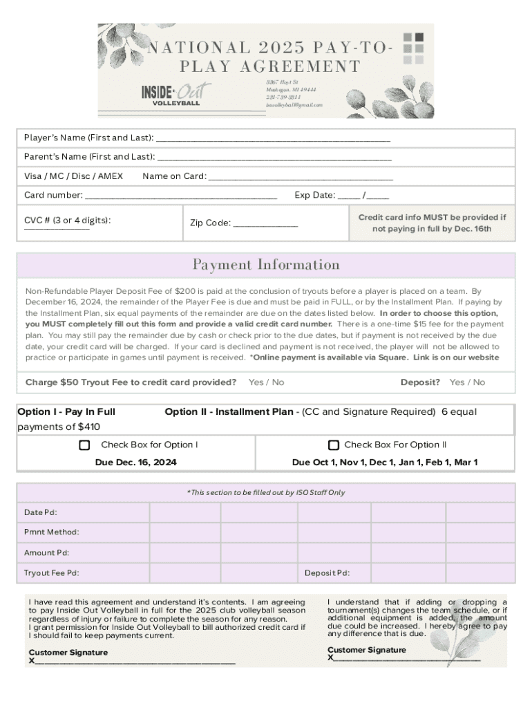 NATIONAL 2025 PAYTOPLAY AGREEMENT 3367 Hoyt St Muskegon, MI 49444 2317393311 isovolleyball@gmail.comPlayers Name (First and Last): ___ Parents Name (First and Last): ___ Visa / MC / Disc / AMEXName
