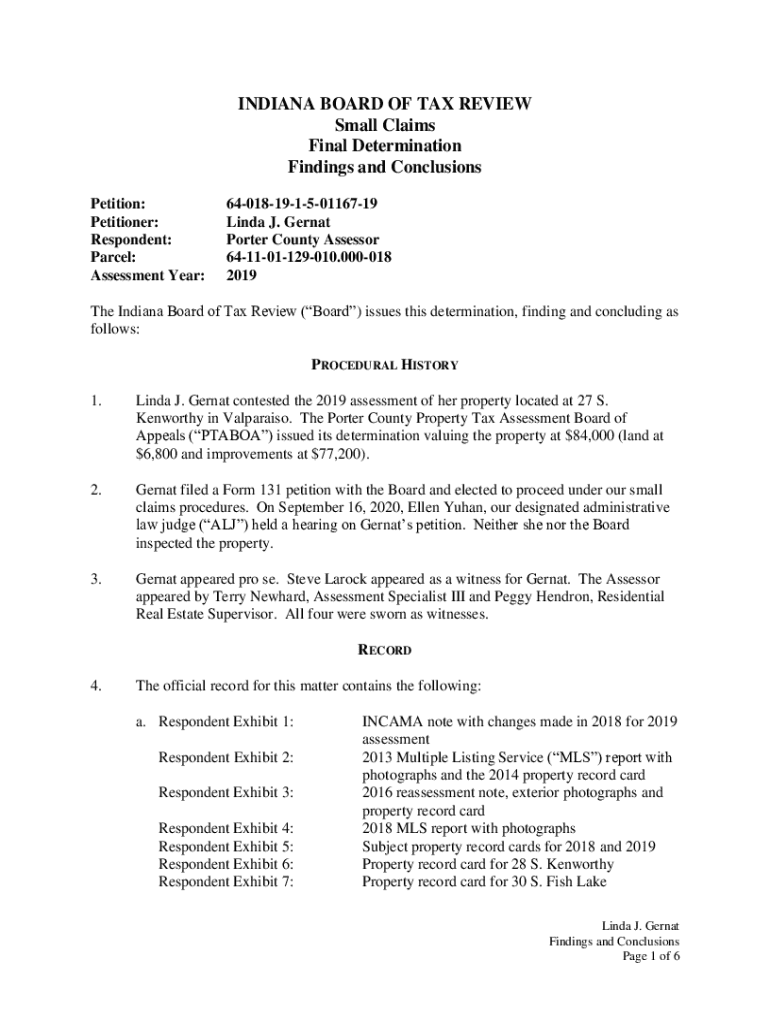 INDIANA BOARD OF TAX REVIEW Small Claims Final Determination Findings and Conclusions Petition: Petitioner: Respondent: Parcel: Assessment Year:6401819150116719 Linda J. Gernat Porter County Assessor