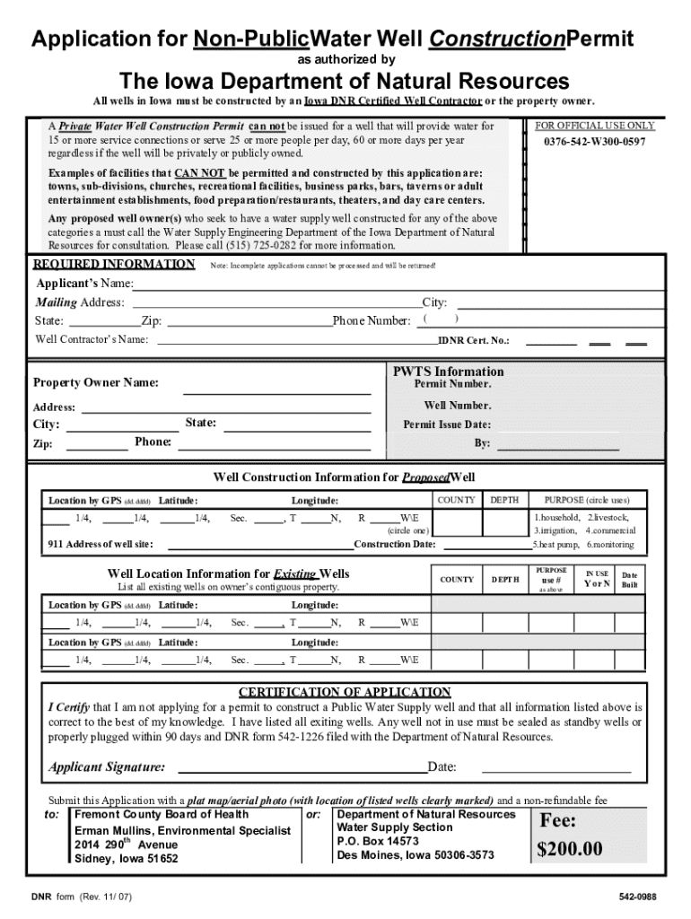 This document is an application for a permit to construct a non-public water well in Iowa. It outlines the necessary information required from the applicant, regulations regarding who can construct wells, and details on prohibited facilities. It emphasizes that all wells must be built by certified contractors and provides instructions for submitting the application along with fees.