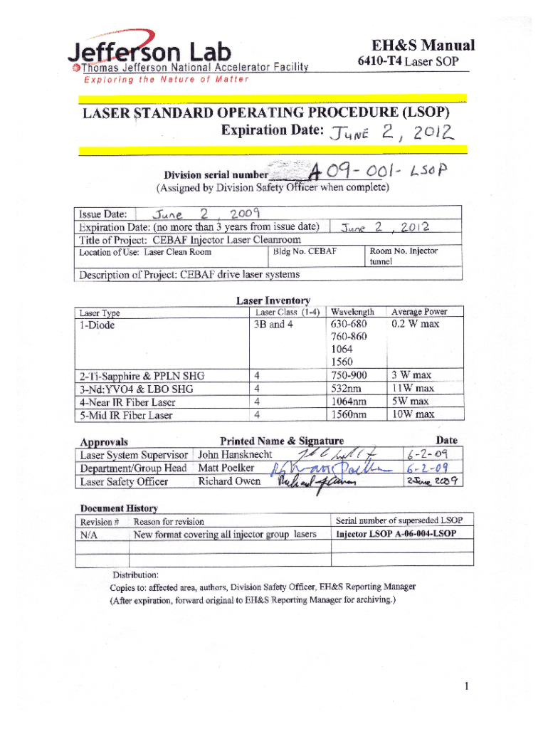This document outlines the safety protocols, procedures, and operational guidelines for the use and maintenance of lasers in the CEBAF Injector clean room. It includes sections detailing personnel requirements, laser inventory, hazard mitigation, written procedures, and emergency protocols, ensuring a comprehensive approach to laser safety.