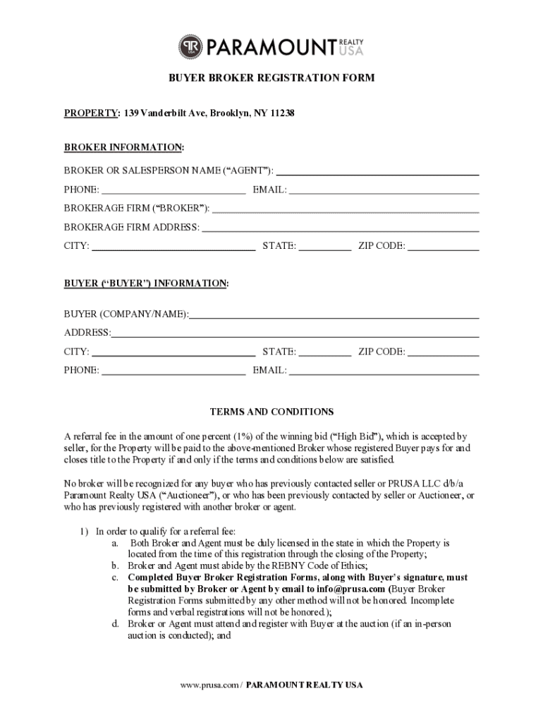 This document is a Buyer Broker Registration Form used to register buyers interested in purchasing a property through an auction. It outlines the necessary broker and buyer information, eligibility conditions for referral fees, and terms and conditions for participation in the auction process.