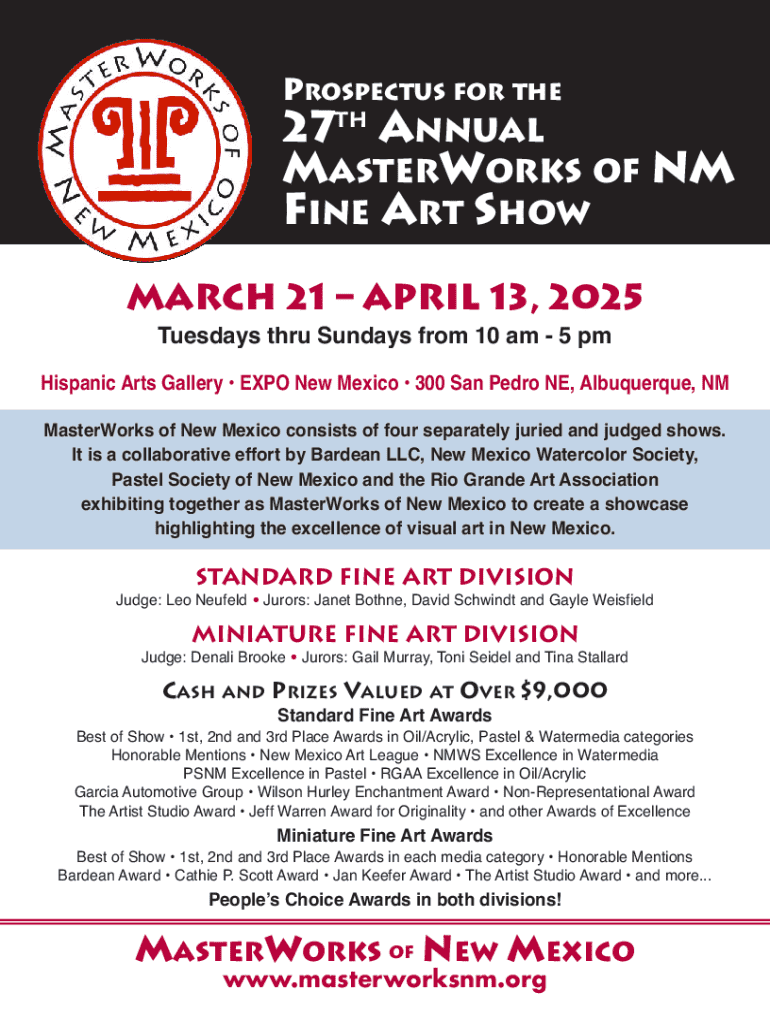 This document serves as the official prospectus for the 27th Annual MasterWorks of NM Fine Art Show, detailing eligibility requirements, entry procedures, judging criteria, and important dates for artists wishing to participate. The event showcases a variety of visual arts and offers substantial cash awards. It features both standard and miniature fine art divisions, emphasizing the excellence of artists in New Mexico.