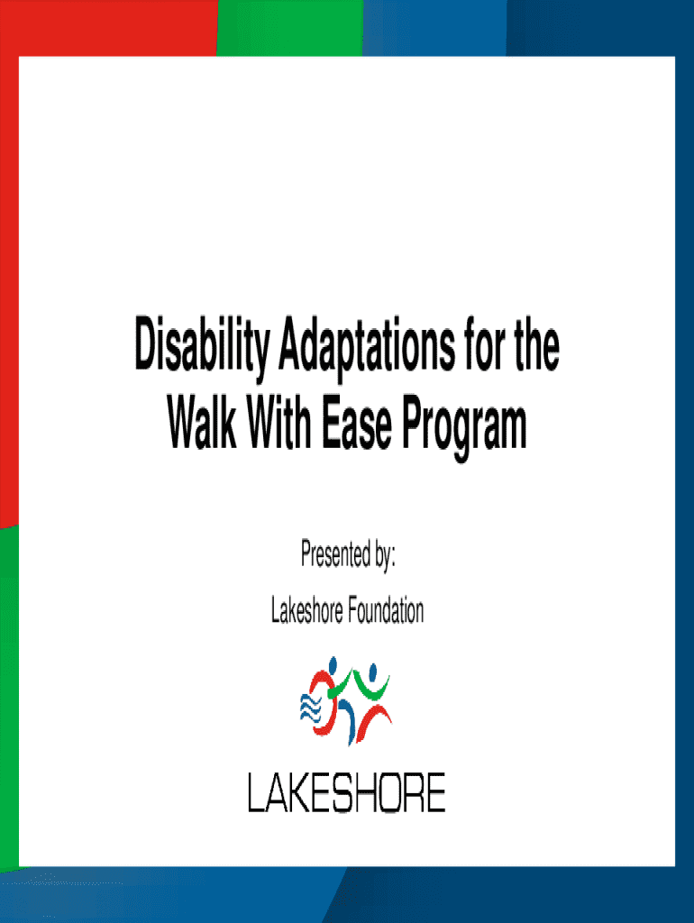 Disability Adaptations for the Walk With Ease Program Presented by: Lakeshore FoundationPresentersChris Mackey Senior Project Coordinator Chris has been with Lakeshore since 2016, leading its work