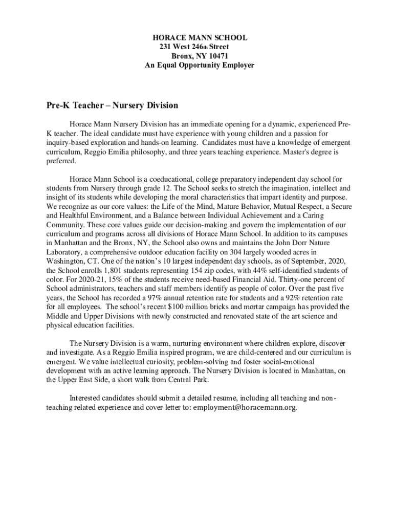 HORACE MANN SCHOOL 231 West 246th Street Bronx, NY 10471 An Equal Opportunity EmployerPreK Teacher Nursery Division Horace Mann Nursery Division has an immediate opening for a dynamic, experienced